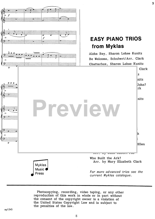 Two traditional rounds are featured in this enjoyable late elementary piano trio, played in the keys of C Major and G Major, 4/4 time. Each performer takes a turn at the opening of the round melody and then steps back, to blend with the other voices. The edition is nicely configured with a separate sheet for each performer's part, and a master score printed on the cover.