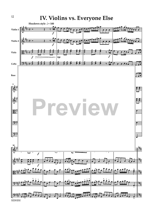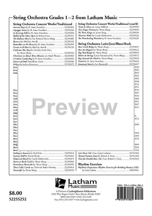Grade 2 * Roundabout, Basses Loaded, The Surprise, Violins vs. Everyone Else. Introduces 6/8, minor keys, shifting for the basses, col legno, pizzicato. It's all around fun for the orchestra!