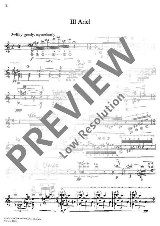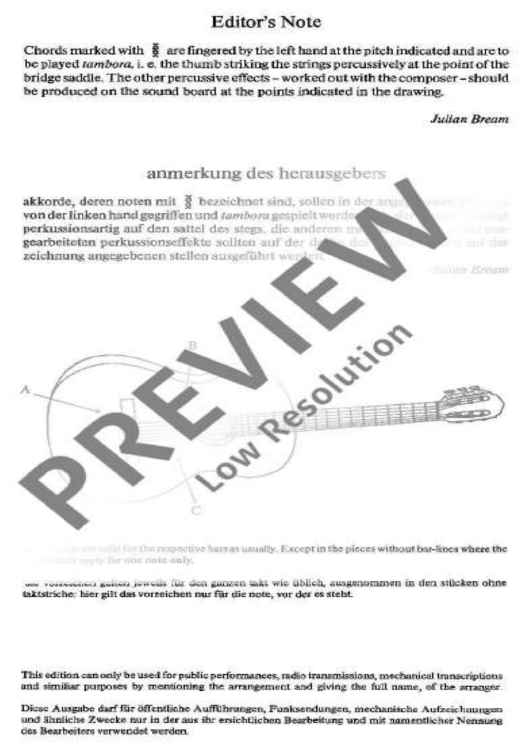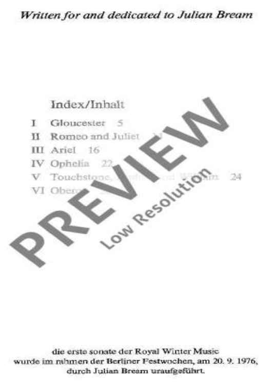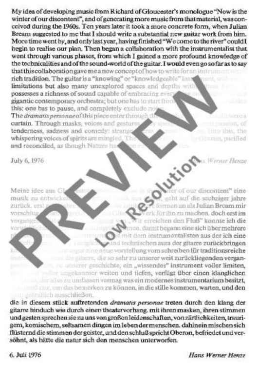 My idea of developing music from Richard of Gloucester's monologue 'Now is the winter of our discontent', and of generating more music from that material, was conceived during the 1960s. Ten years later it took a more concrete form, when Julian Bream suggested to me that I should write a substanial new guitar work for him. More time went by, and only having finished 'We Come to the River' could I begin to realise our plan. Then began a collaboration with the instrumentalist that went through various phases, from which I gained a more profound knowledge of the technicalities and of the sound-world of the guitar. I would even go so far as to say that this collaboration gave me a new concept of how to write for an instrument with a rich tradition. The guitar is a 'knowing' or 'knowledgeable' instrument, with many limitations but also many unexplored spaces and depths within these limits. It possesses a richness of sound capable of embracing everything one might find in a gigantic contemporary orchestra; but one has to start from silence in order to notice this: one has to pause, and completely exclude noise. The dramatis personae of this piece enter through the sound of the guitar as if it were curtain. Through masks, voices and gestures, they speak to us of great passion, of tenderness, sadness and comedy: strange events in people's lives. Into this, the whispering voices of spirits are mingled. The epilogue is spoken by Oberon, pacified and reconciled, as though Nature had been subjected to Man. - Hans Werner Henze