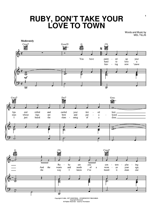 "Ruby, Don't Take Your Love To Town" Sheet Music by Kenny Rogers