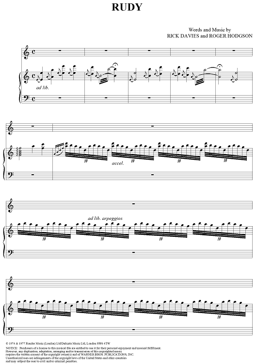 Digital Sheet Music for Rudy by Rick Davies, Roger Hodgson, Supertramp scored for Piano/Vocal/Chords; id:272558