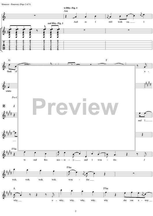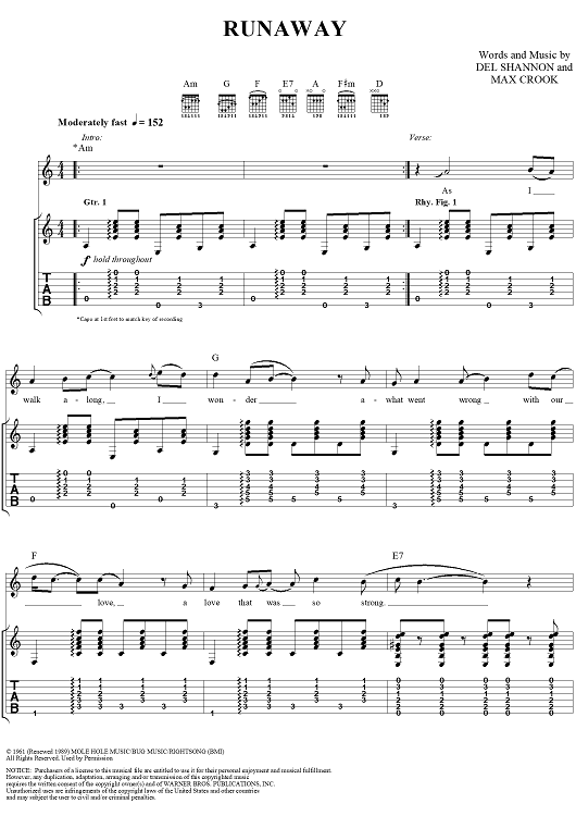 Digital Sheet Music for Runaway by Del Shannon, Max Crook scored for Easy Guitar Tab/Vocal; id:234664