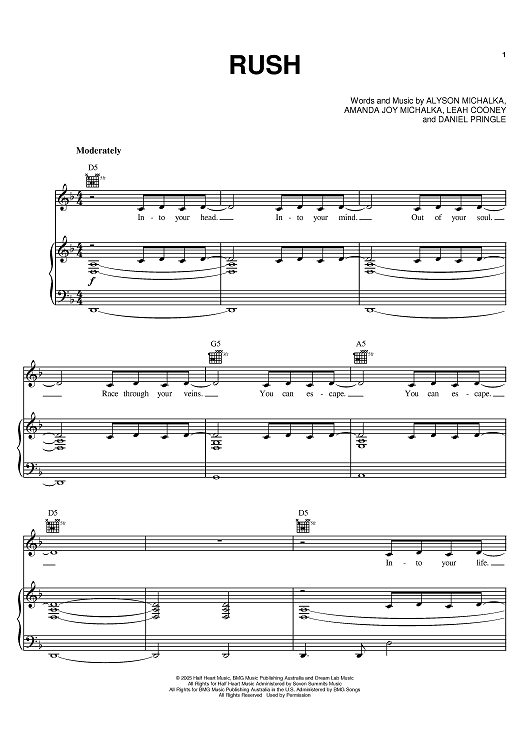 Digital Sheet Music for Rush by Aly & AJ, Leah Cooney, Alyson Michalka, Amanda Joy Michalka, Daniel Pringle scored for Piano/Vocal/Chords; id:389436