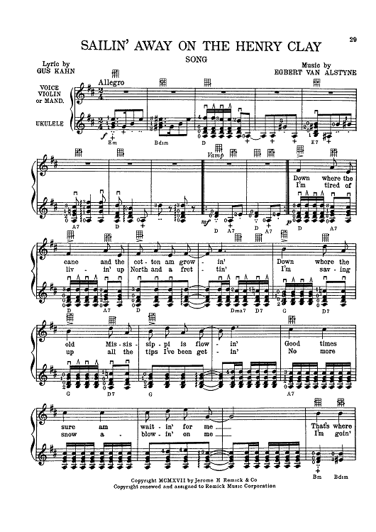 Digital Sheet Music for Sailin' Away On The Henry Clay by , Gus Kahn, Egbert Van Alstyne scored for Ukulele; id:418525