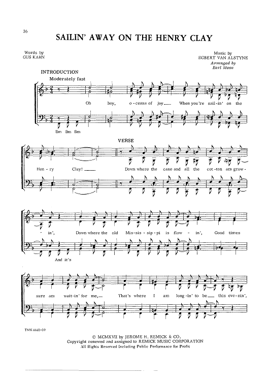 Digital Sheet Music for Sailin' Away On The Henry Clay by Gus Kahn, Egbert Van Alstyne, Earl Moon scored for Barbershop Quartet; id:423844