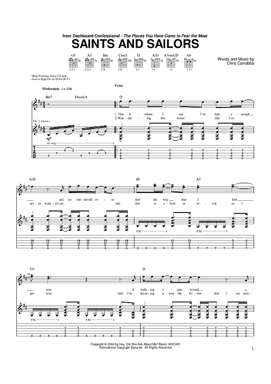 Digital Sheet Music for Saints And Sailors by Chris Carrabba, Dashboard Confessional scored for Guitar Tab; id:380530