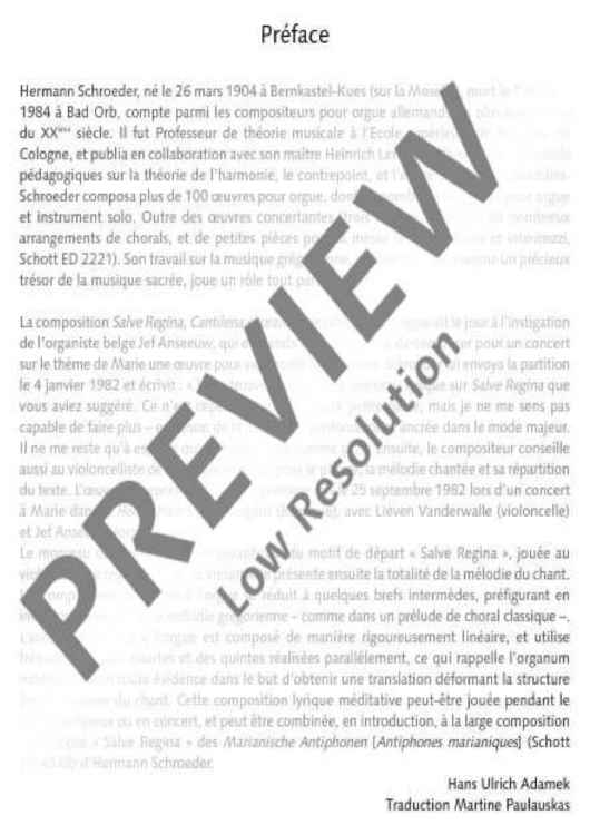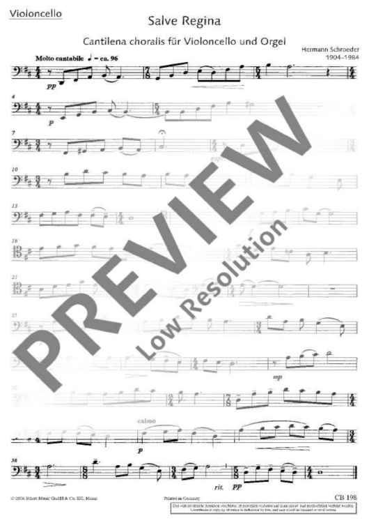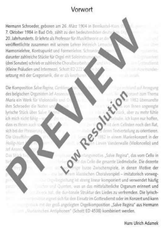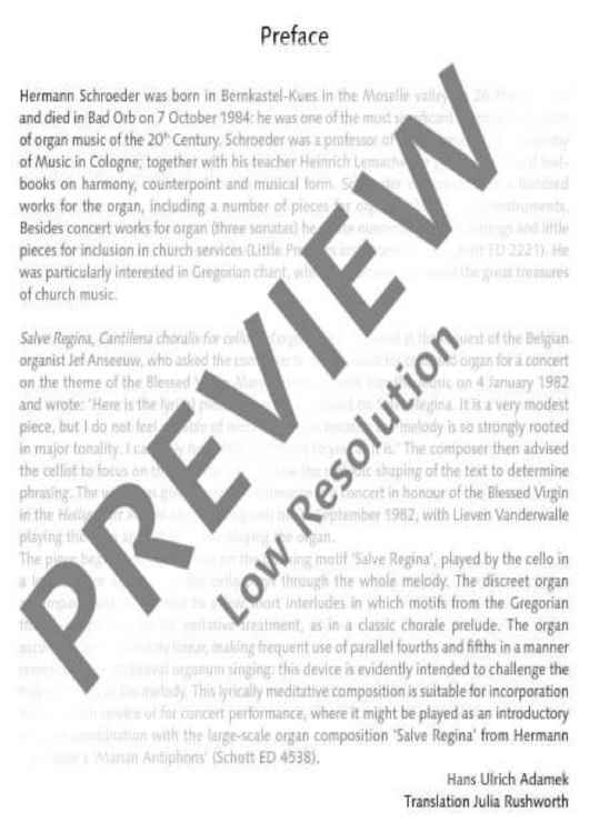 This little work was composed at the suggestion of the Belgian organist Jef Anseeuw who performed the world premiere at the Heilig-Hart Kerk in Izegem on 25 September 1982 together with Lieven Vanderwalle on the violoncello. The piece begins with a paraphrase of the initial motif 'Salve Regina' which is intonated by the cello in the low register. The cello then plays the entire melody of the song. The decent organ accompaniment is limited to some short interludes in which motifs of the Gregorian melody, as in a classical chorale prelude, are played in advance in an imitative manner. The lyrical, meditative composition is ideal for services or concerts and can be combined as an introductory piece with the large-scale organ composition 'Salve Regina' from Schroeder's 'Marianische Antiphone' (ED 4538).