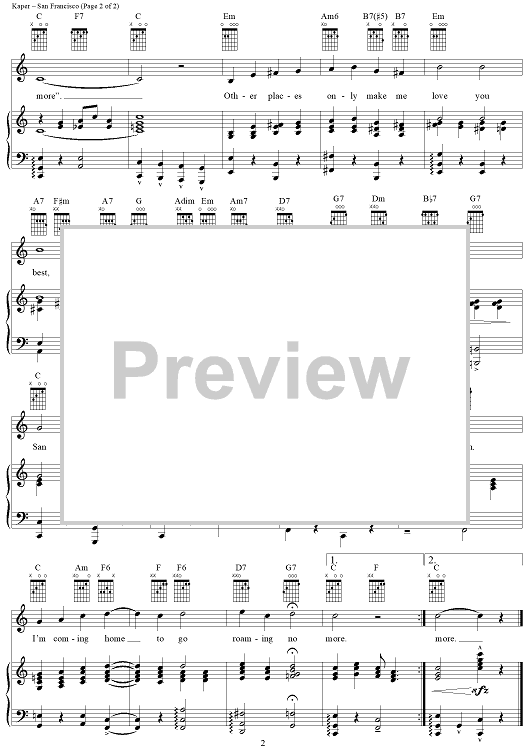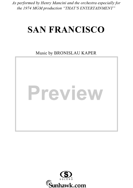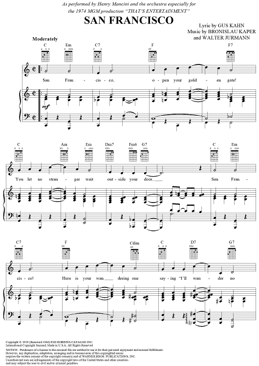 Digital Sheet Music for San Francisco by Henry Mancini, Gus Kahn, Bronislau Kaper, Walter Jurmann scored for Piano/Vocal/Chords; id:250013