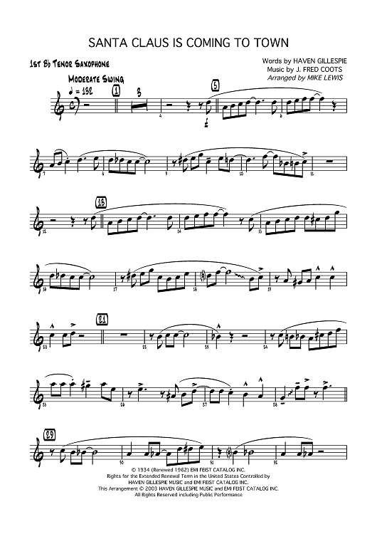 Digital Sheet Music for Santa Claus is Coming to Town - B-flat Tenor Saxophone 1 by Haven Gillespie, J. Fred Coots, Mike Lewis scored for Jazz Ensemble; id:358512