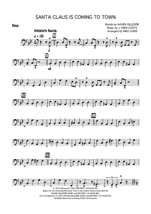 Digital Sheet Music for Santa Claus is Coming to Town - Bass by Haven Gillespie, J. Fred Coots, Mike Lewis scored for Jazz Ensemble; id:358529