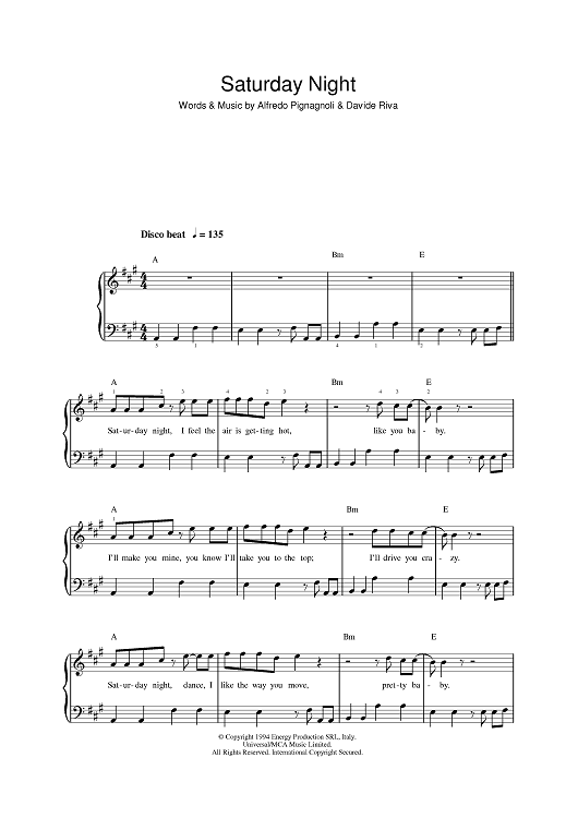 Digital Sheet Music for Saturday Night by Alfredo Pignagnoli, Davide Riva, Whigfield scored for Piano/Vocal/Chords; id:393483