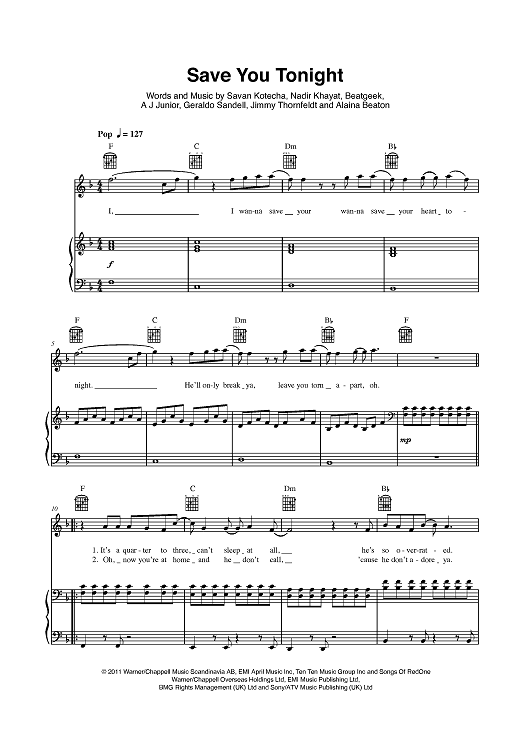Digital Sheet Music for Save You Tonight by Savan Kotecha, Nadir Khayat, One Direction, Beatgeek, A J Junior, Geraldo Sandell, Jimmy Thornfeldt, Alaina Beaton scored for Piano/Vocal/Chords; id:432864