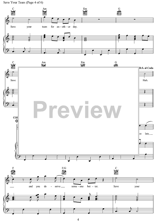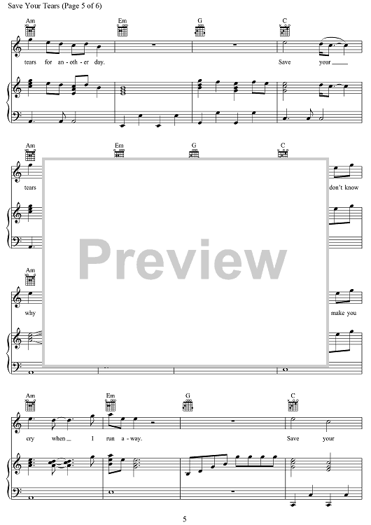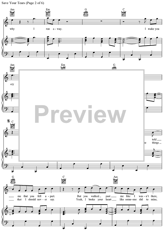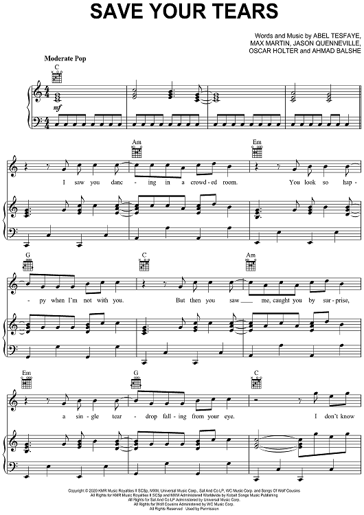 Digital Sheet Music for Save Your Tears by Max Martin, Ahmad Balshe, Abel Tesfaye, Jason Quenneville, Oscar Holter, The Weeknd scored for Piano/Vocal/Chords; id:468852