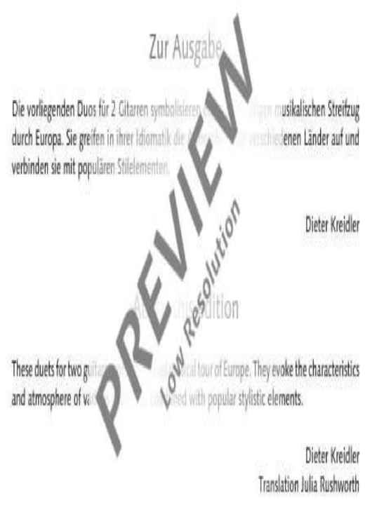 These duos for two guitars present an entertaining musical survey of European music, capturing the atmosphere of the different countries in their language and combining them with popular stylistic elements.