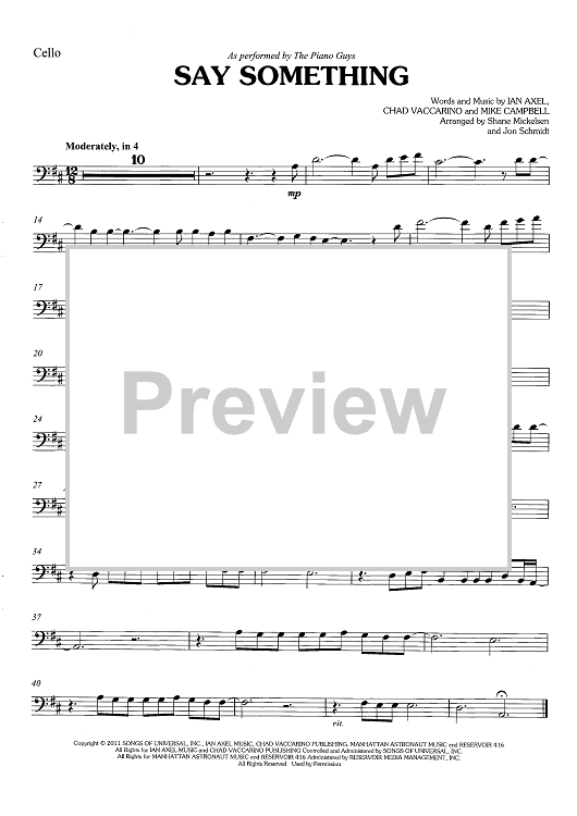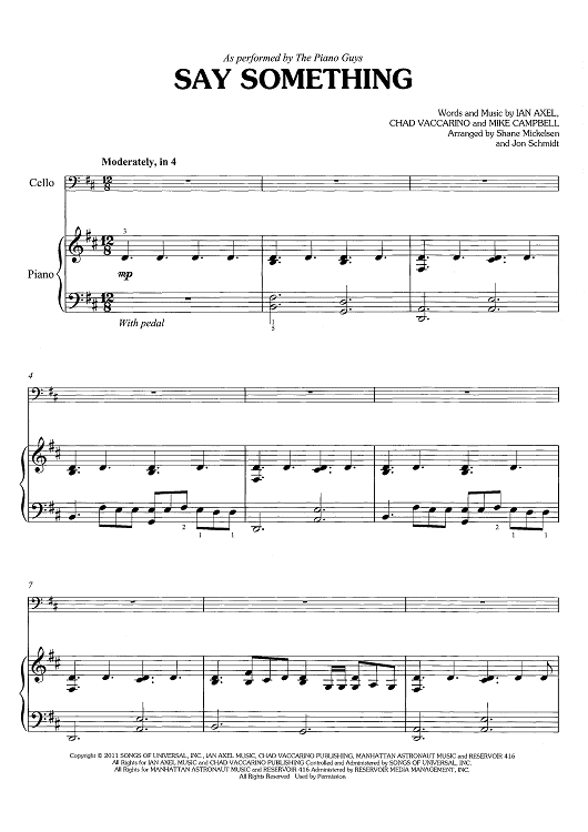 Digital Sheet Music for Say Something by Mike Campbell, Jon Schmidt, Ian Axel, Chad Vaccarino, The Piano Guys, Shane Mickelsen scored for Cello and Piano; id:465594