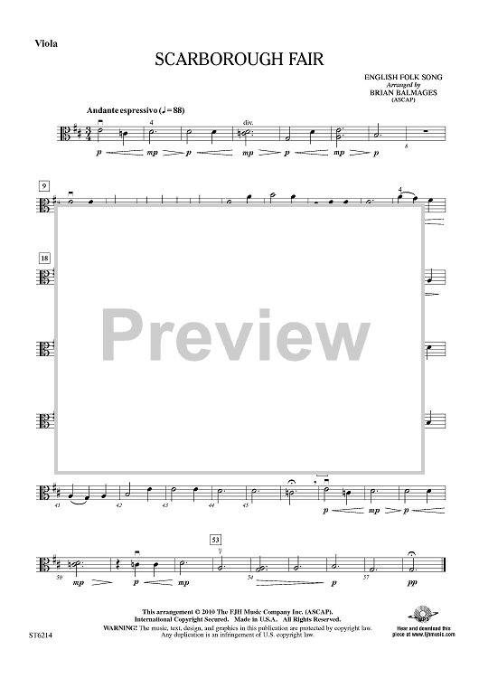 Digital Sheet Music for Scarborough Fair - Viola by English Folk Song, Brian Balmages scored for Orchestra; id:411585