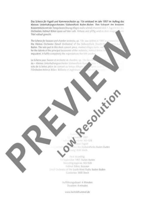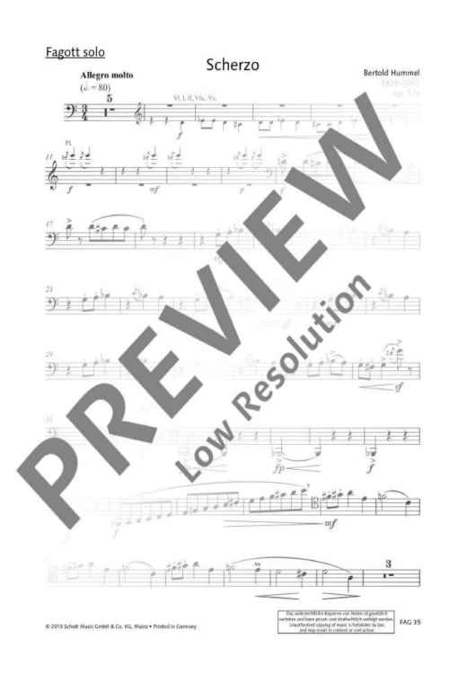 Although Bertold Hummel composed this Scherzo for bassoon and chamber orchestra more than fifty years ago, the piece still captivates every listener with its youthful, carefree liveliness. Virtuoso and witty, it does justice to its title in every respect. It was created in 1957 upon commission of the Kleines Unterhaltungsorchester Südwestfunk Baden-Baden. The solo part of the four-minute concert piece with the tempo indication 'allegro molto' was tailor-made by Hummel for the orchestra's principal bassoonist Helmut Böker. In addition to the hire material, a piano score with solo part is now available on sale.