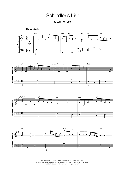 Digital Sheet Music for Schindler's List by John Williams scored for Piano; id:380730