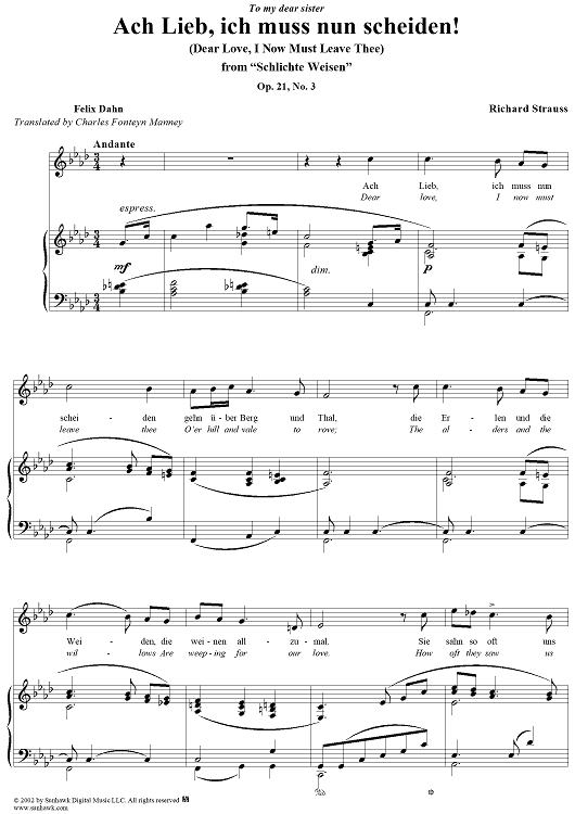 Digital Sheet Music for Schlichte Weisen, Op. 21, No. 3: Ach Lieb, ich muss nun scheiden! (Dear love, I now must leave thee) by Richard Strauss, Felix Dahn scored for Voice/Piano; id:256065