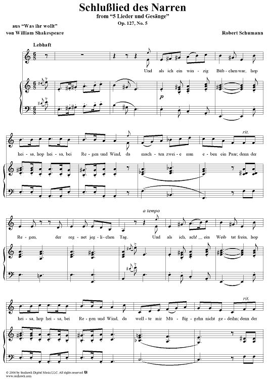 Digital Sheet Music for Schlußlied des Narren, Op. 127, No. 5 by Robert Schumann, William Shakespeare scored for Voice/Piano; id:316347
