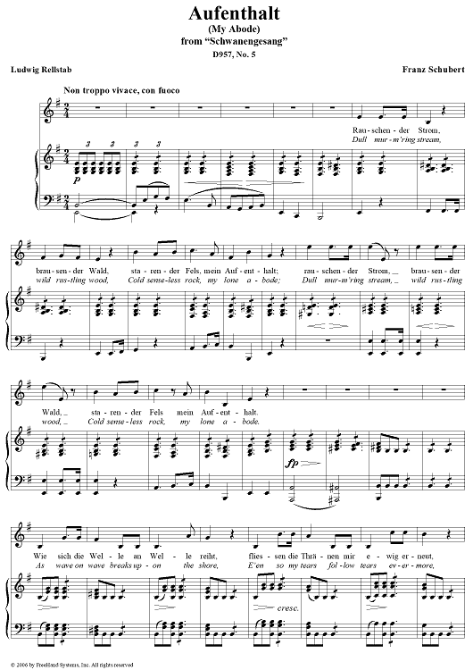 Digital Sheet Music for Schwanengesang, D957, No. 5: Aufenthalt (My Abode) by Franz Schubert, Ludwig Rellstab scored for Voice/Piano; id:256486