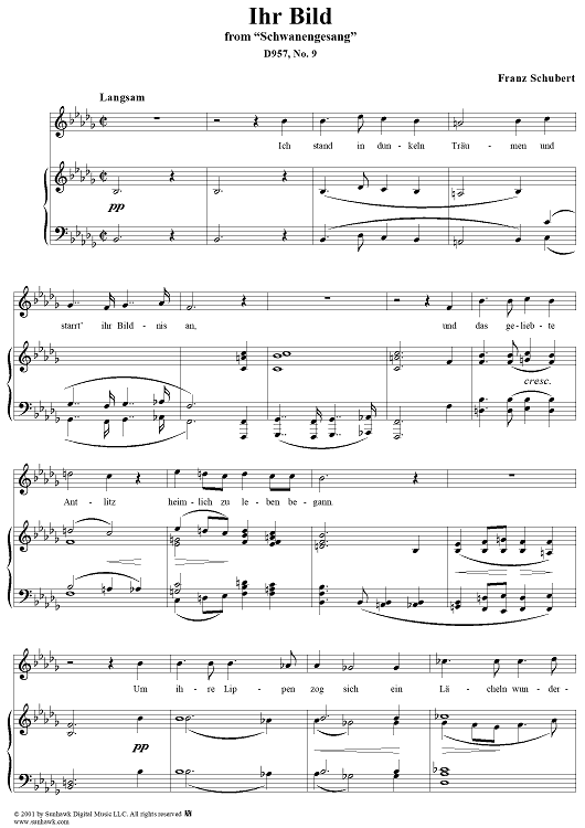 Digital Sheet Music for Schwanengesang, D957, No. 9: Ihr Bild (Her Portrait) by Franz Schubert, Heinrich Heine scored for Voice/Piano; id:256680