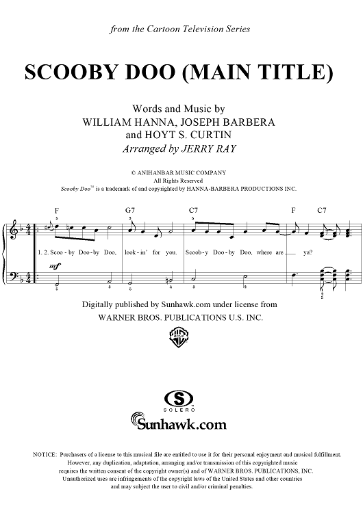Digital Sheet Music for Scooby Doo (Main Title) by Joseph Barbera, Hoyt Curtin, Jerry Ray, William Hanna scored for Easy Piano/Vocal; id:197223