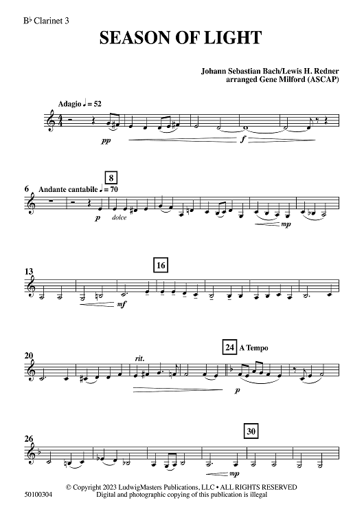 Digital Sheet Music for Season of Light - Bb Clarinet 3 by Lewis H. Redner, Johann Sebastian Bach, Gene Milford scored for Concert Band; id:509176