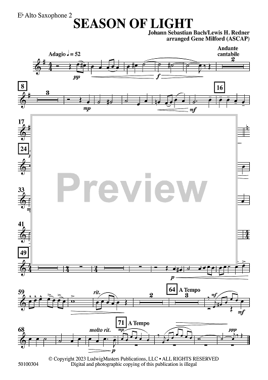 Digital Sheet Music for Season of Light - Eb Alto Saxophone 2 by Lewis H. Redner, Johann Sebastian Bach, Gene Milford scored for Concert Band; id:509179