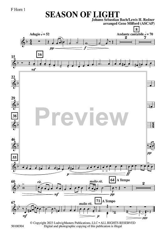 Digital Sheet Music for Season of Light - F Horn 1 by Lewis H. Redner, Johann Sebastian Bach, Gene Milford scored for Concert Band; id:509185