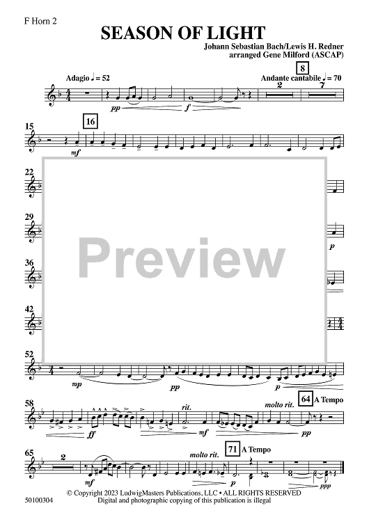 Digital Sheet Music for Season of Light - F Horn 2 by Lewis H. Redner, Johann Sebastian Bach, Gene Milford scored for Concert Band; id:509186