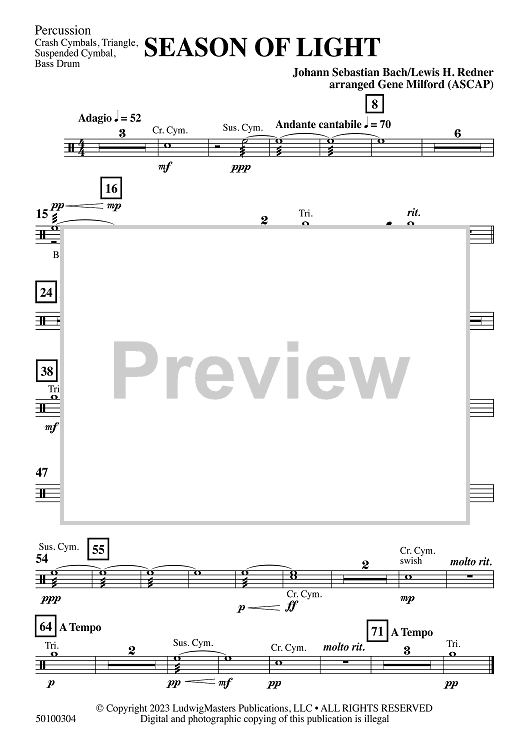 Digital Sheet Music for Season of Light - Percussion by Lewis H. Redner, Johann Sebastian Bach, Gene Milford scored for Concert Band; id:509195
