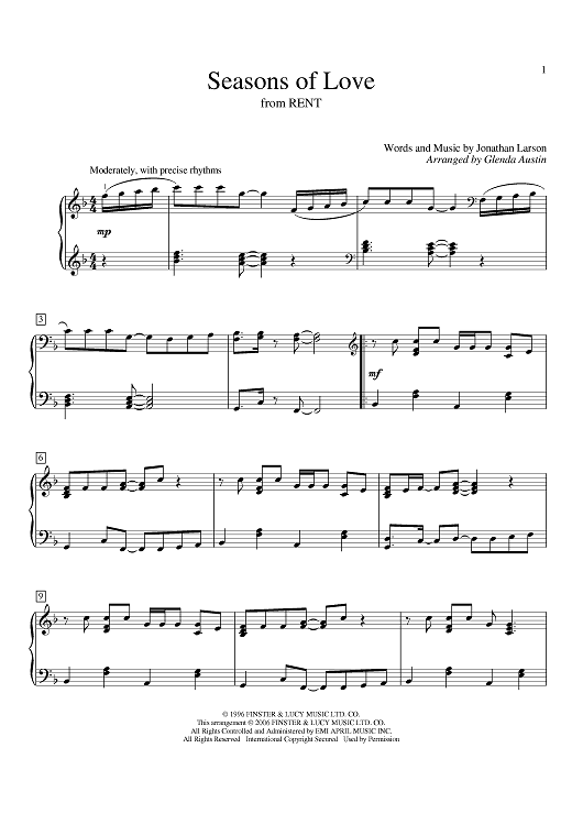 Digital Sheet Music for Seasons Of Love by Jonathan Larson scored for Piano; id:392948