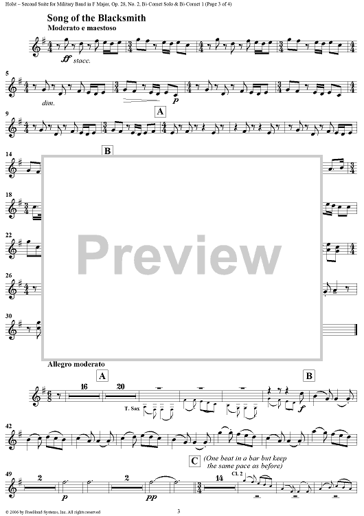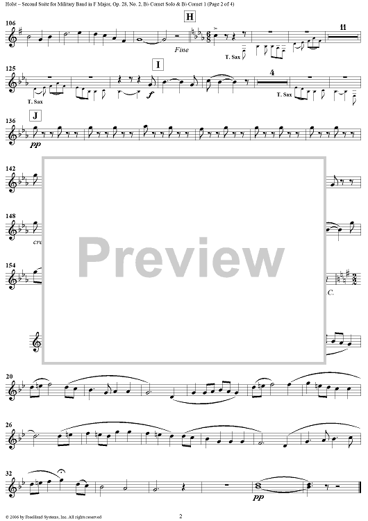 Digital Sheet Music for Second Suite in F - B-flat Cornet 1 by Gustav Holst scored for Concert Band; id:311151