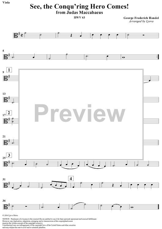 Digital Sheet Music for See, the Conqu'ring Hero Comes! - Viola by , George Frideric Handel, Ljova scored for String Quartet; id:320706