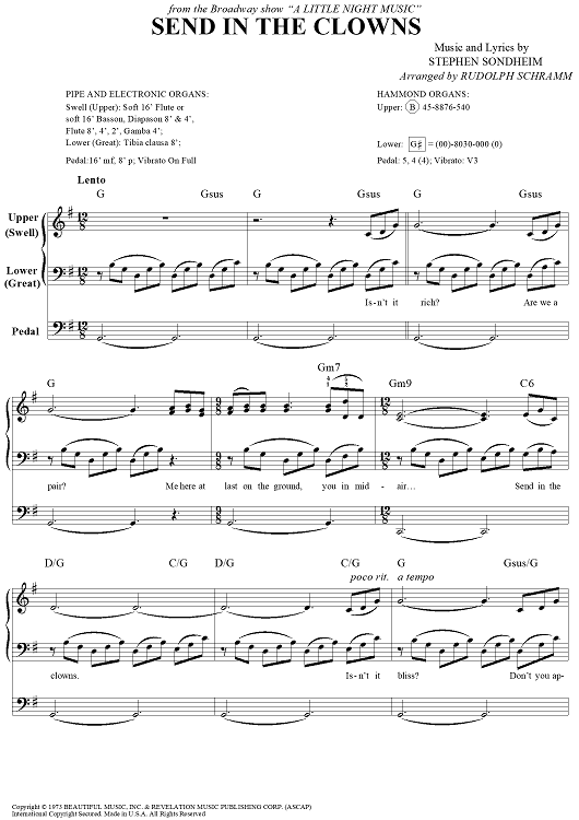 Digital Sheet Music for Send In The Clowns by Stephen Sondheim, Judy Collins, Rudolph Schramm, Barbra Streisand scored for Easy Organ/Vocal; id:115858