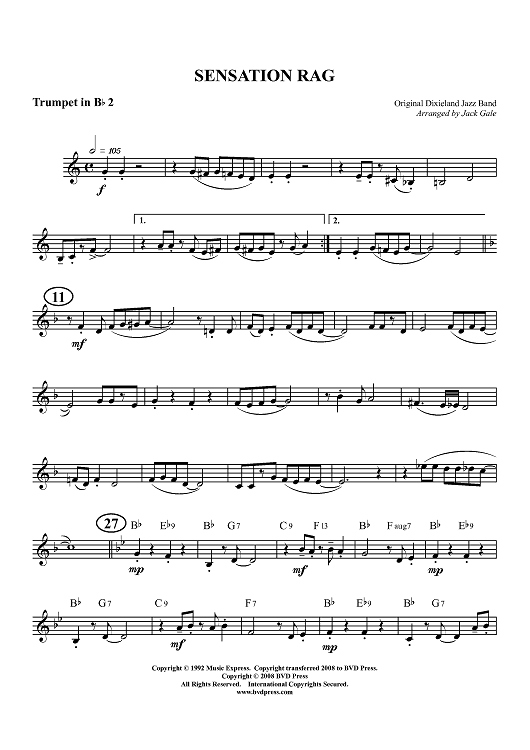 Digital Sheet Music for Sensation Rag - Trumpet 2 by , Original Dixieland Jazz Band, Jack Gale scored for Brass Quintet; id:411829