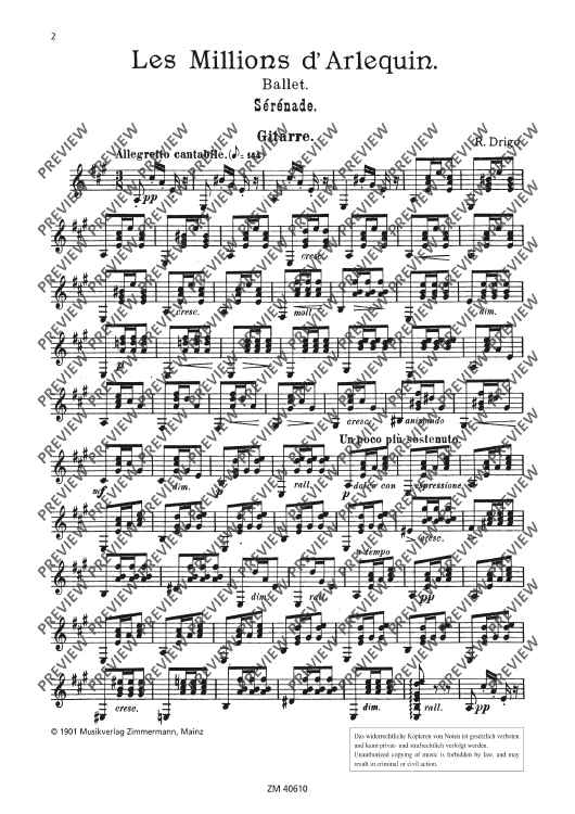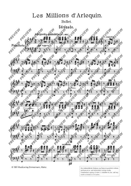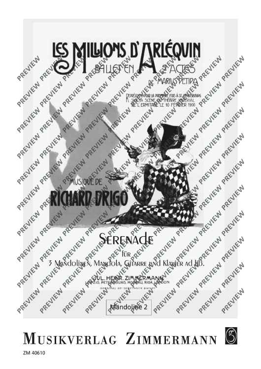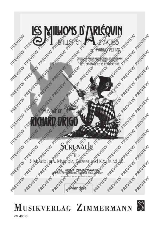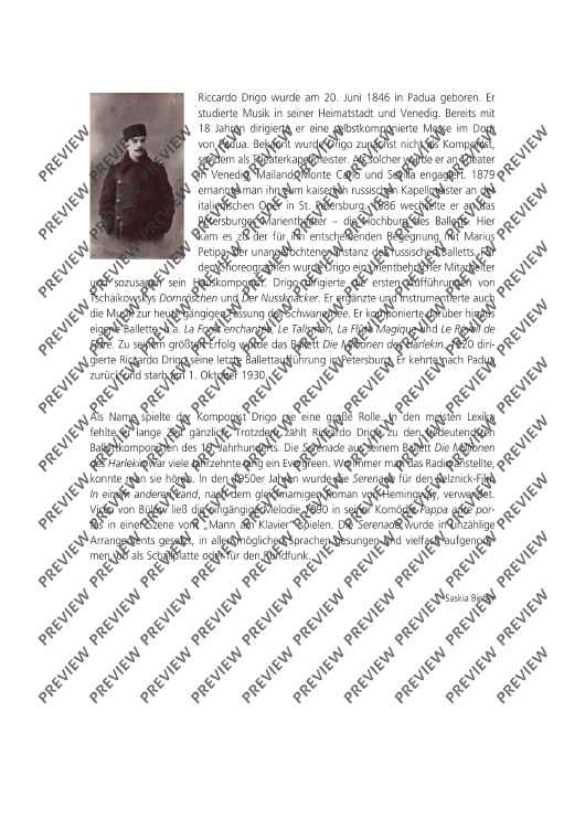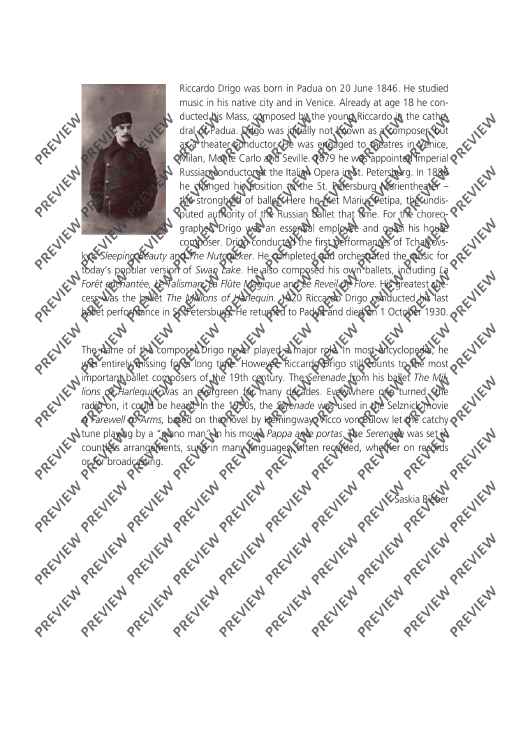 Riccardo Drigo (1846-1930) zählt zu den bedeutendsten Ballettkomponisten des 19. Jahrhunderts. Die Serenade aus seinem Ballett 'Die Millionen des Harlekin' war viele Jahrzehnte lang ein Evergreen. Sie wurde in unzählige Arrangements gesetzt, in allen möglichen Sprachen gesungen und vielfach aufgenommen.