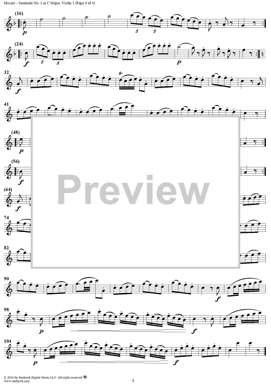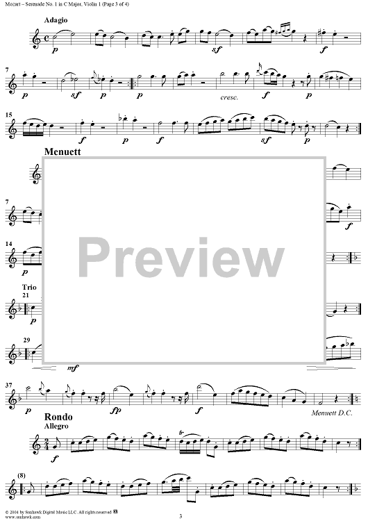 Digital Sheet Music for Serenade No. 1 in C Major from "Five Viennese Serenades" - Violin 1 by Wolfgang Amadeus Mozart scored for Two Violins/Cello; id:304152