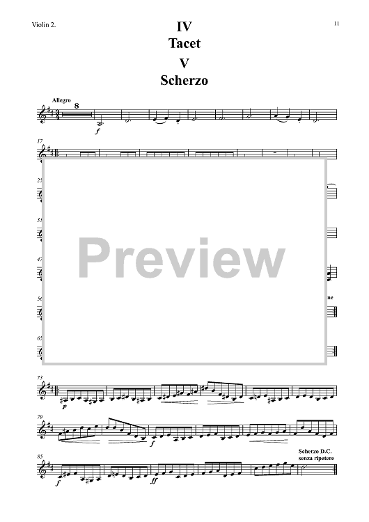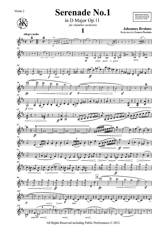 Digital Sheet Music for Serenade No. 1 in D Major Op.11 - Violin 2 by Johannes Brahms, Franco Pisciotta scored for Chamber Orchestra; id:505417