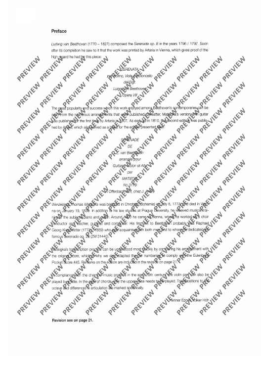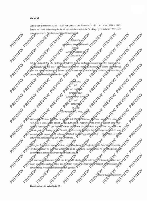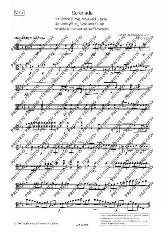 In 1807, Matiegka rearranged Beethoven's Serenade in D major op. 8 for violin, viola and violoncello and made it into a trio with guitar - a version which soon became very popular at the time. This new edition makes this precious work available again. For studying purposes, the scores of the original instrumentation can be used.