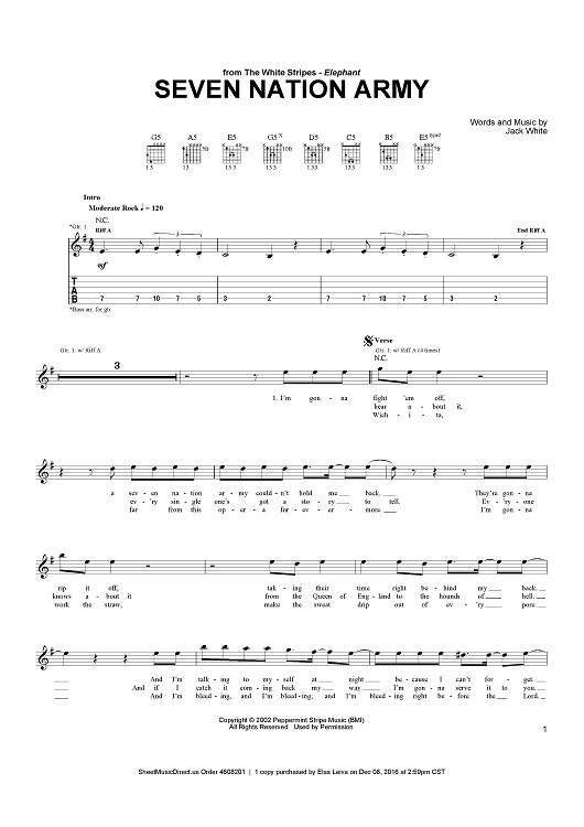 Digital Sheet Music for Seven Nation Army by The White Stripes, Jack White scored for Guitar Tab/Vocal/Chords; id:463397