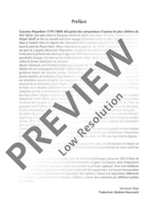 Mit seinen Sieben geistlichen Gesängen stellt Giacomo Meyerbeer einmal mehr unter Beweis, dass er nicht nur als Opernkomponist Epochales hinterlassen, sondern auch einige „Schätze der Chormusik“ geschaffen hat. Seinen vierstimmigen religiösen Gesängen liegen mehrstrophige Texte von Friedrich Gottlob Klopstock zugrunde. Ursprünglich schrieb Meyerbeer diese von aufklärerischer Frömmigkeit durchströmten Liedmotetten 1812 für solistisches Vokalensemble. Knapp 30 Jahre später brachte er sie dann, erweitert um Optionen für eine wechselweise chorische und solistische Ausführung und eine (intonationssichernde) Klavierbegleitung ad libitum, zweisprachig (deutsch/französisch) heraus. Eine gut zu bewältigende, aber dennoch sehr wirkungsvolle Repertoirebereicherung für jeden ambitionierten Laien- bzw. Kirchenchor.