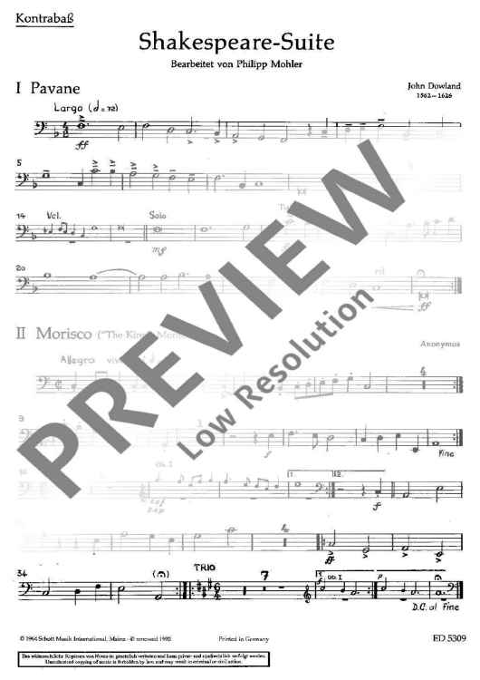 Digital Sheet Music for Shakespeare Suite - Double Bass by Philipp Mohler scored for Strings, Woodwinds And Harpsichord (lute Ad Libitum); id:482201