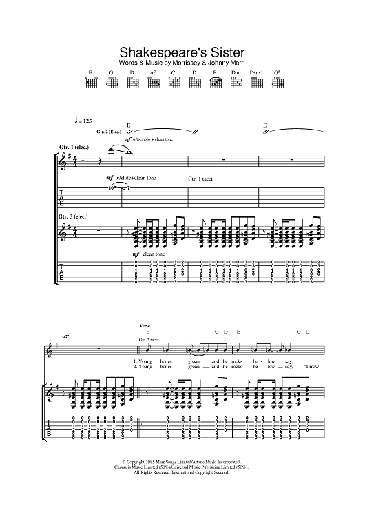 Digital Sheet Music for Shakespeare's Sister by Johnny Marr, The Smiths, Morrissey scored for Guitar Tab; id:386991