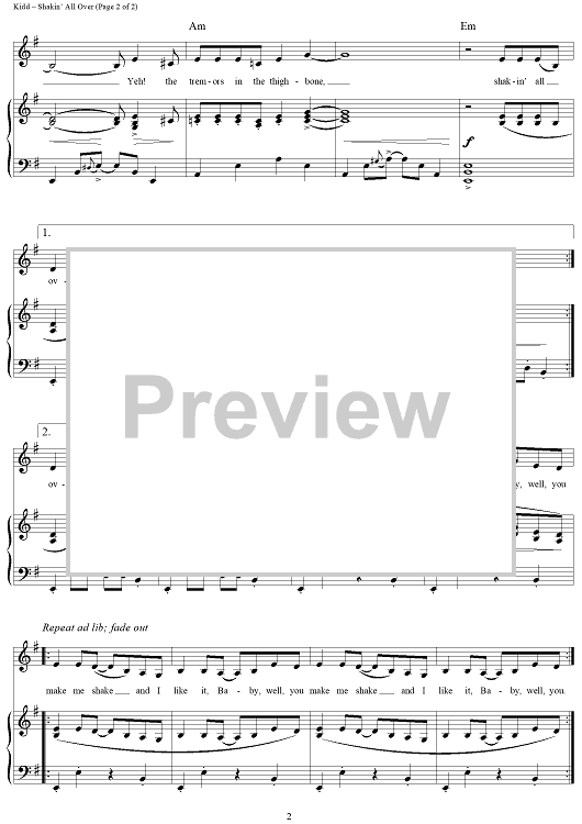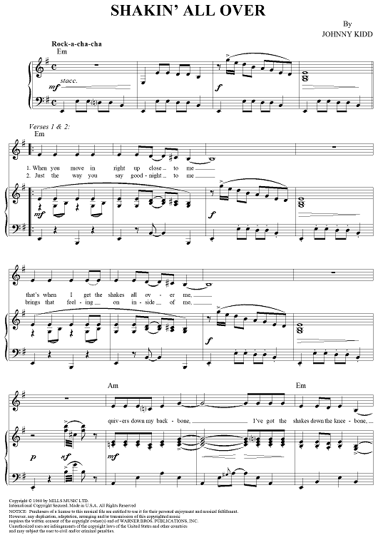 Digital Sheet Music for Shakin' All Over by Johnny Kidd, Johnny Kidd & The Pirates scored for Piano/Vocal/Chords; id:250089