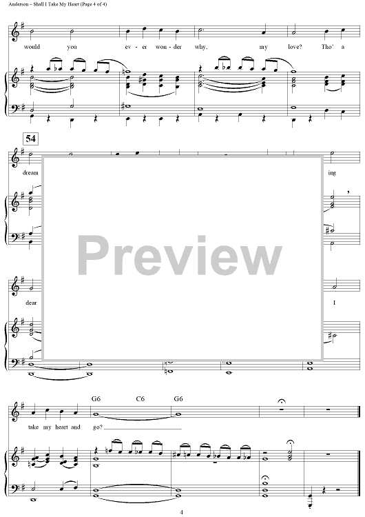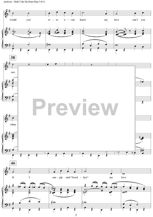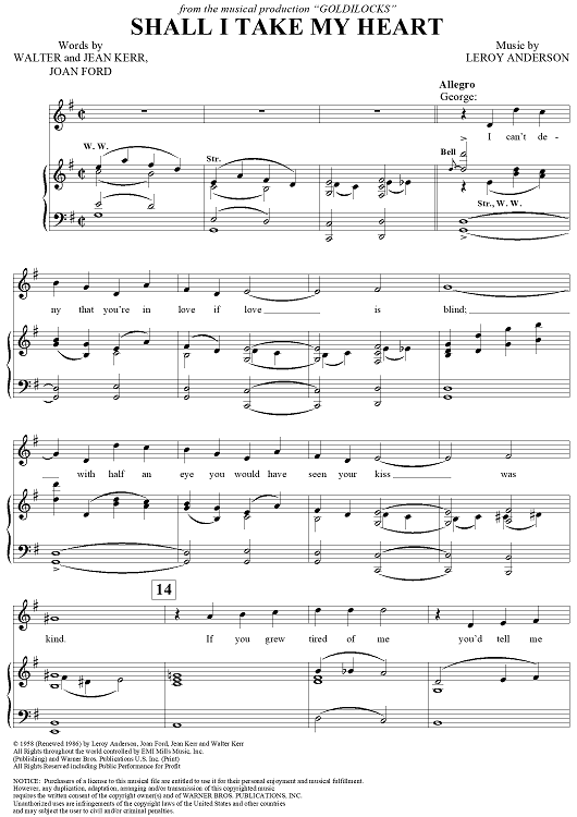 Digital Sheet Music for Shall I Take My Heart by Leroy Anderson, Walter Kerr, Jean Kerr, Joan Ford scored for Piano/Vocal; id:183980