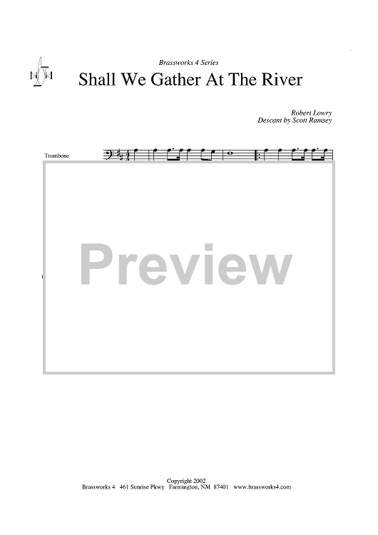 Digital Sheet Music for Shall We Gather At The River - Trombone by Robert Lowry scored for Brass Quartet with Optional Descant; id:317271