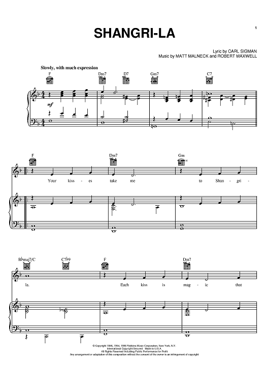 Digital Sheet Music for Shangri-la by Robert Maxwell, Carl Sigman, Matt Malneck scored for Piano/Vocal/Chords; id:374412