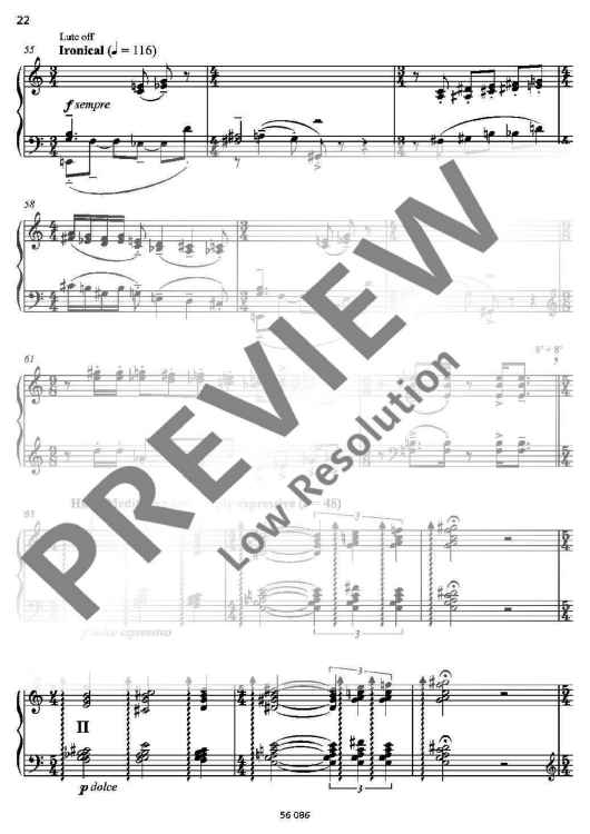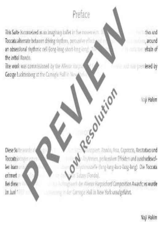 This suite has been conceived as an imaginary ballet in five movements: Rondo, Aria, Capriccio, Recitativo and Toccata. It features driving rhythms, percussive effects and expressive harmonic motifs.